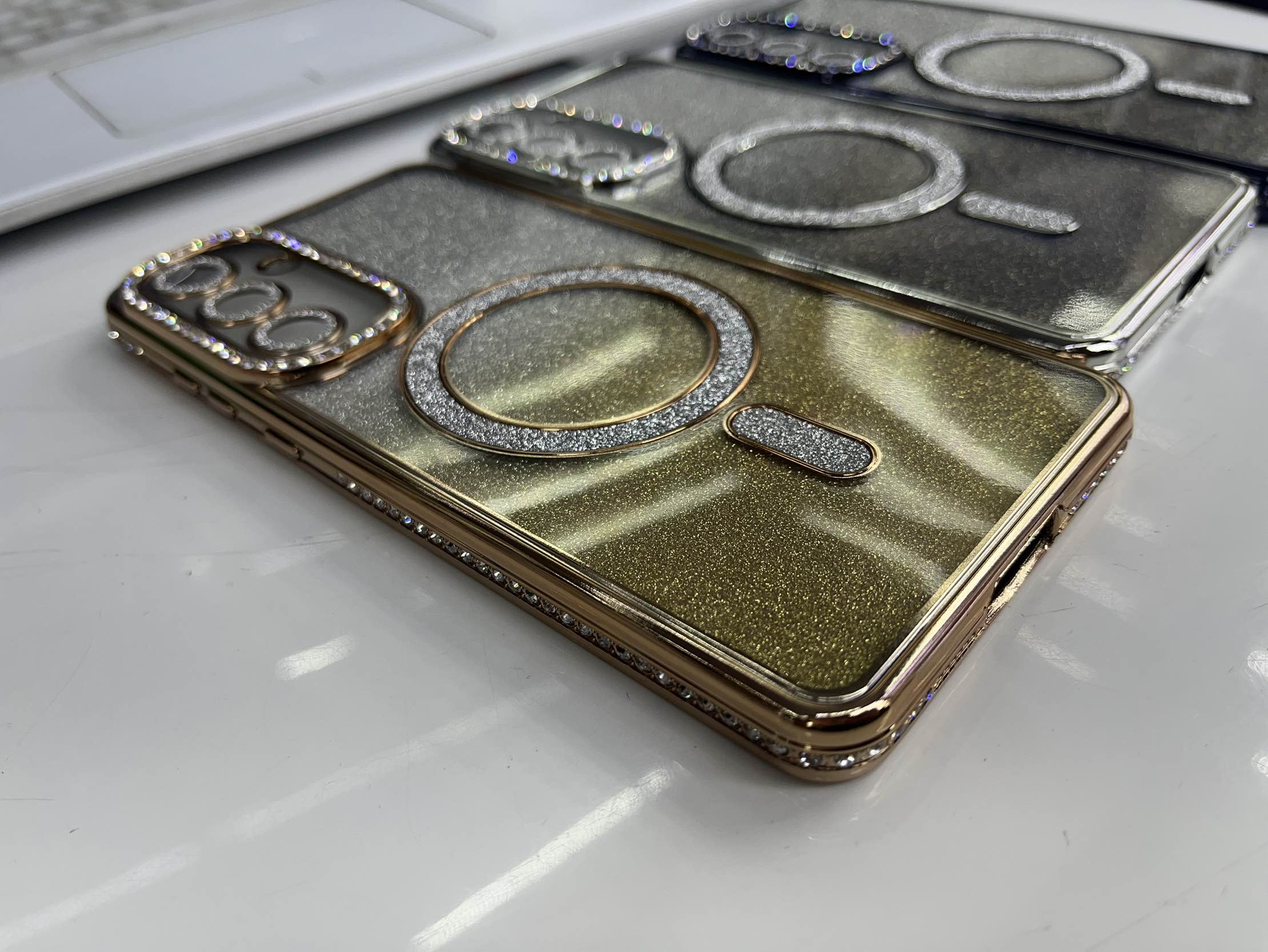 اگر به دنبال ظاهری مجلل هستید، رنگ طلایی این قاب بهترین گزینه است. ترکیب رنگ طلایی با نگینهای درخشان، جلوهای سلطنتی به گوشی شما میدهد.